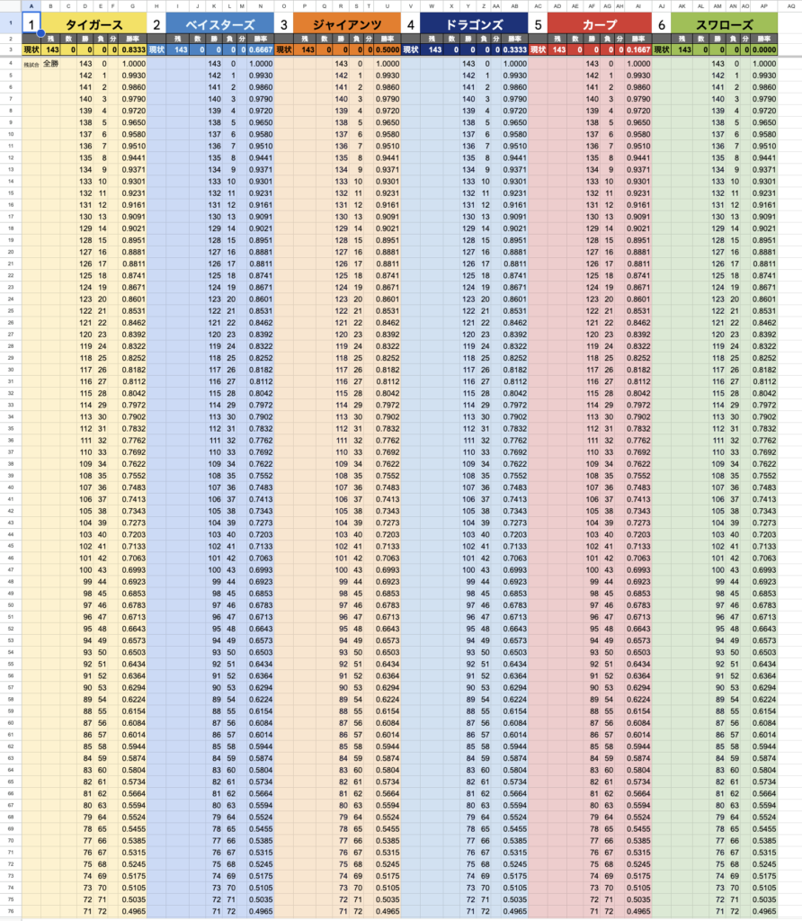残り試合を◯勝◯敗だった場合の勝率がわかる表(パリーグもあるよ)